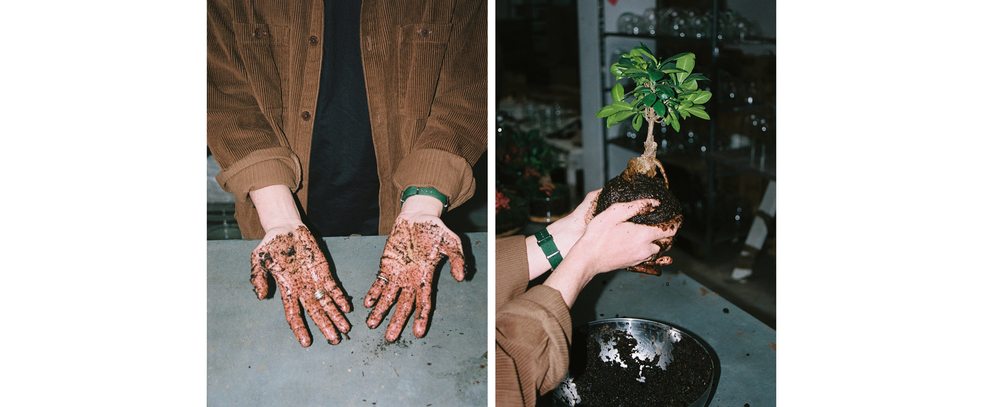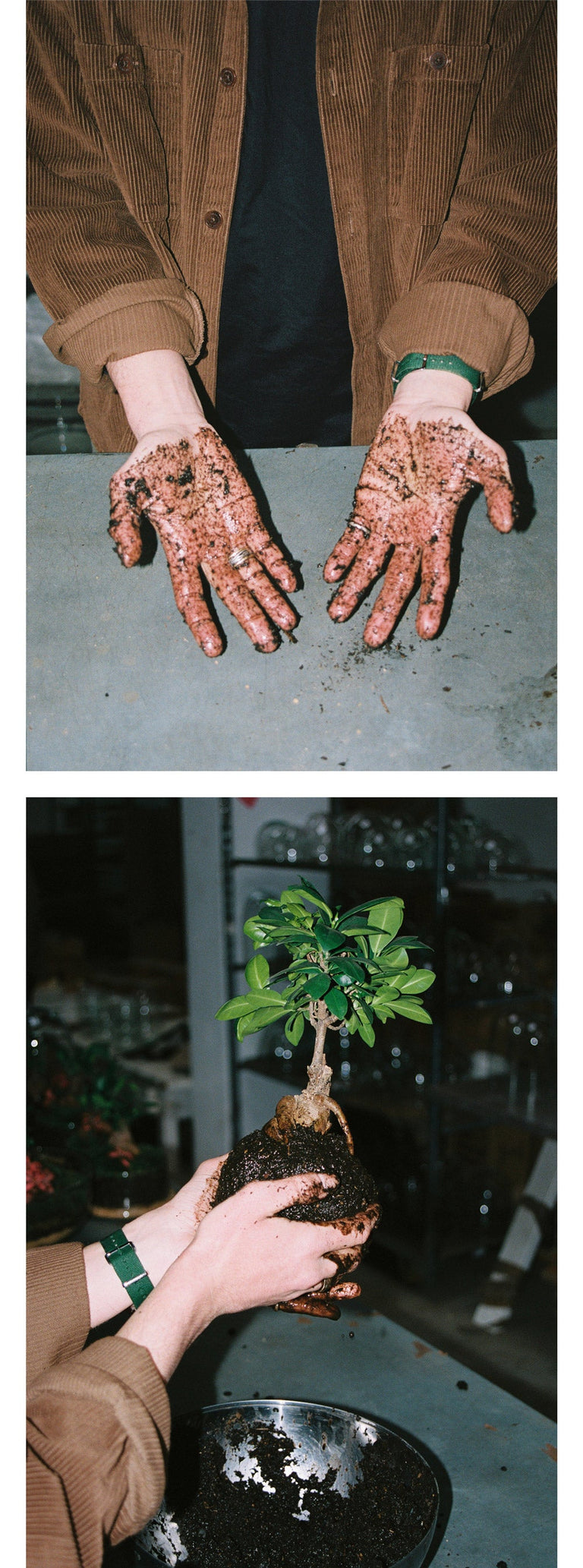這些植物裝在花盆(通常由塑膠製成)中抵達Omotesandō ,隨後更換為永續容器。就苔蘚植物而言,正如它們的名字所揭示的——日語中的“苔蘚球”——它們被移植到一個由100%天然材料製成的容器中:一大塊由土壤和培養的苔蘚組成的物體,最終成為你的新花盆。