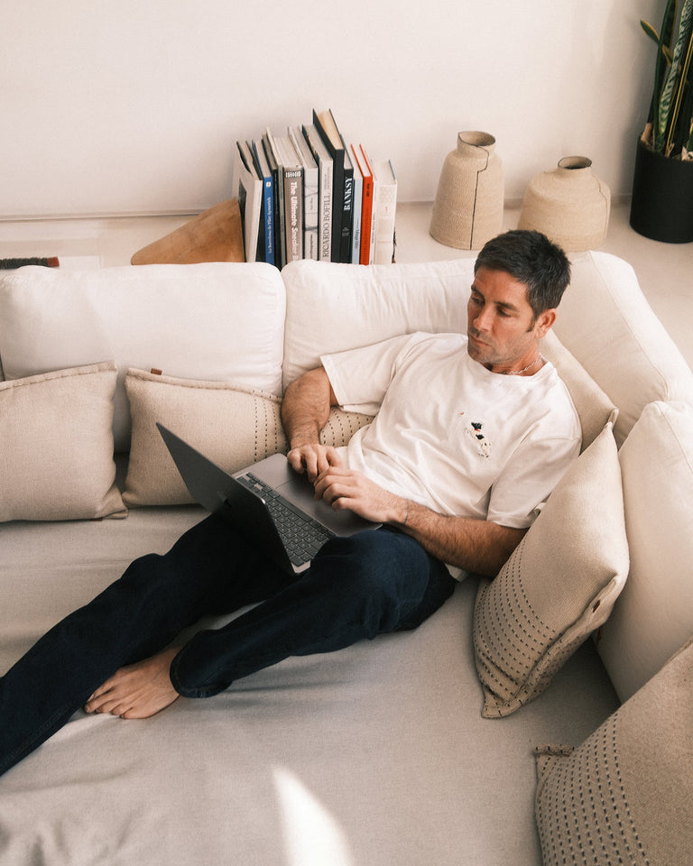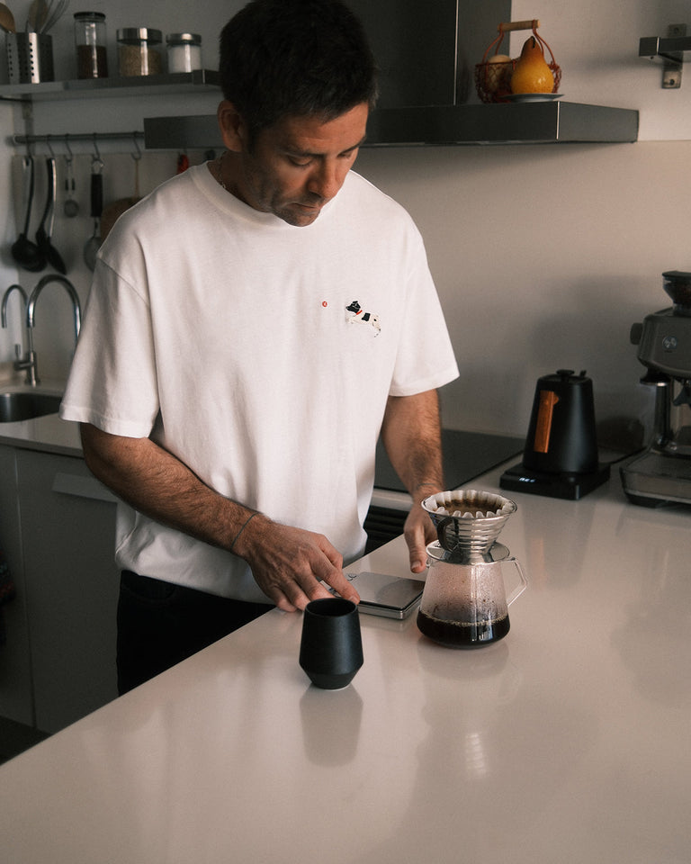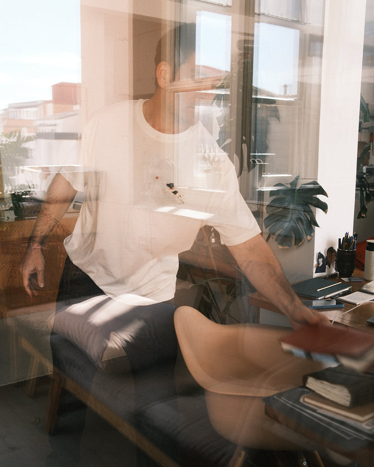 Camiseta blanca Aaron hecha de algodón orgánico y bordada a mano por la artista Elia Flores Fraile.