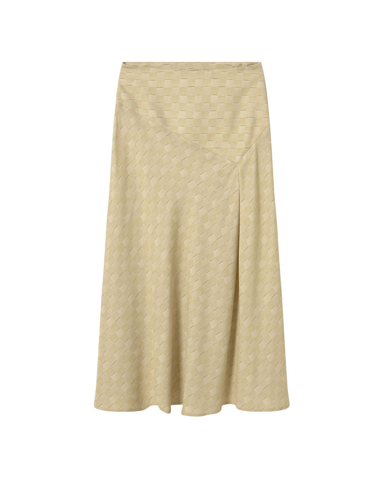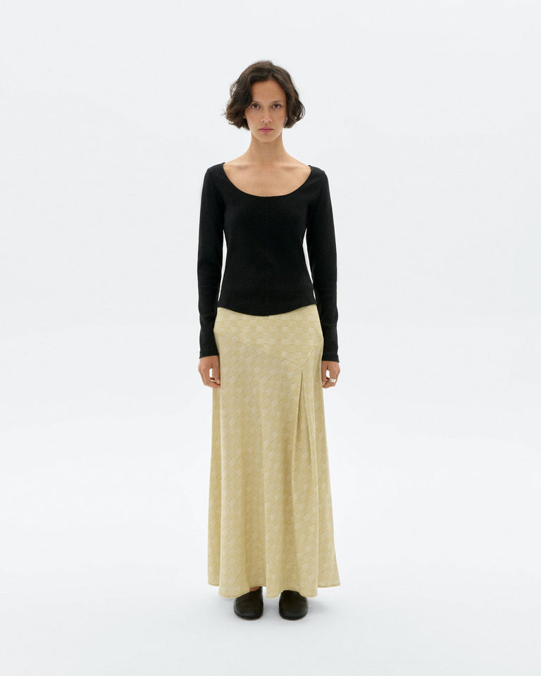 Falda larga amarilla cuadros Tori hecha de tencel diseñada en colaboración con la artista y diseñadora Júlia Esqué, que ha creado distintos estampados inspirados en la cestería y el trabajo artesanal, a partir de papeles de colores.